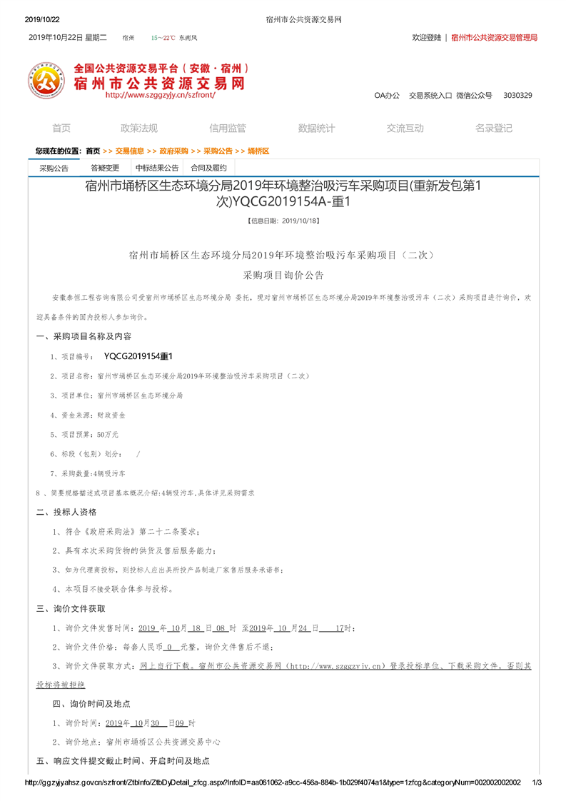 宿州市埇桥区生态环境分局2019年环境整治吸污车采购项目(二次)采购项目询价公告