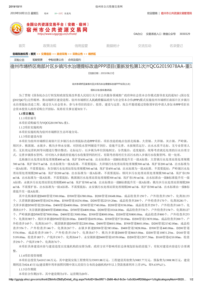 宿州市埇桥区南部片区乡镇污水治理提标改造PPP项目(二次)招标公告(投标邀请函)