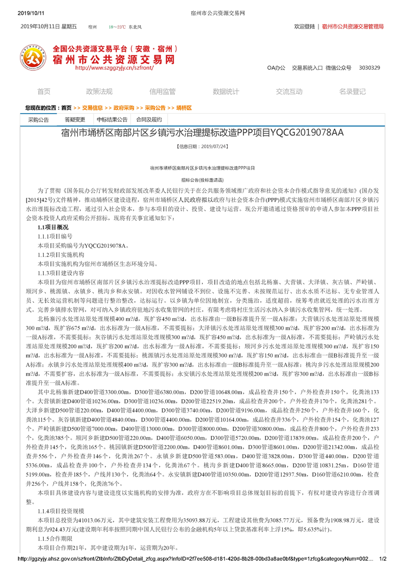 宿州市埇桥区南部片区乡镇污水治理提标改造PPP项目招标公告(投标邀请函)