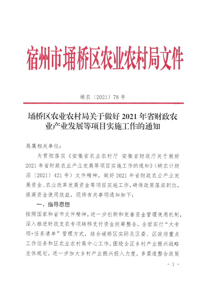 埇桥区农业农村局关于做好2021年省财政农业产业发展等项目实施工作的通知