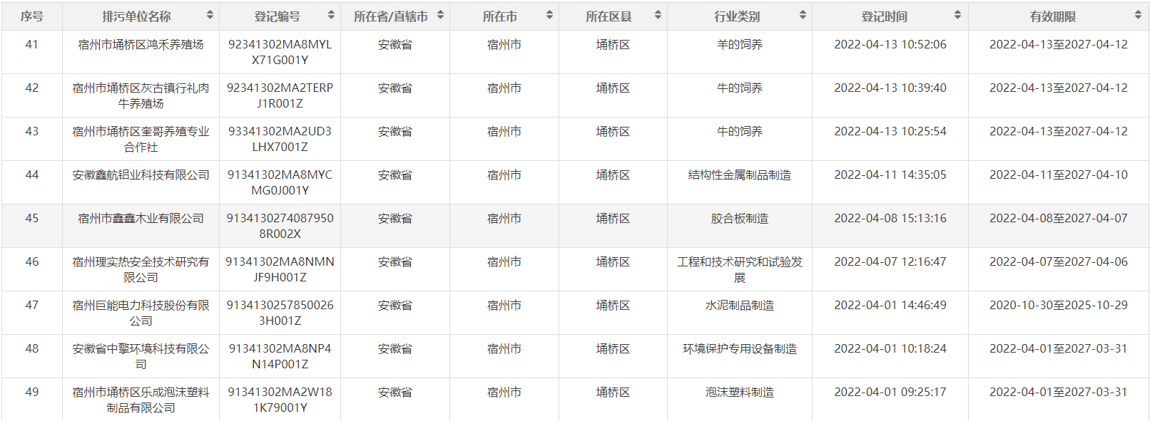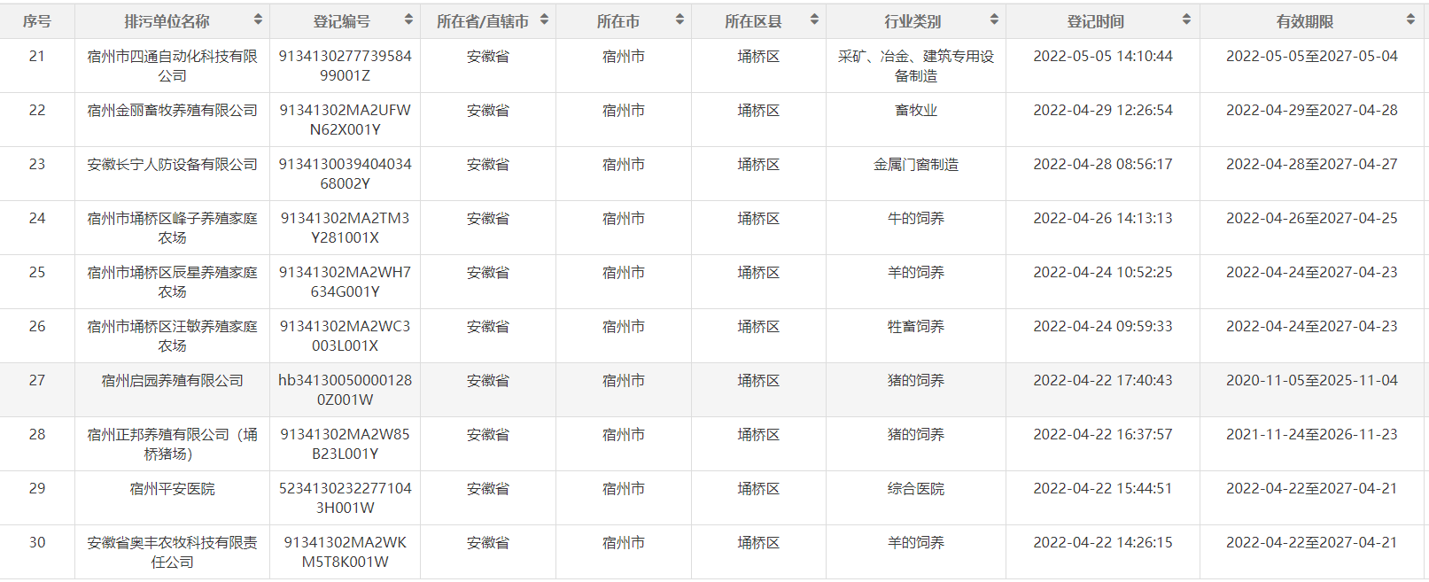 2022年埇桥区生态环境分局第二季度排污名单