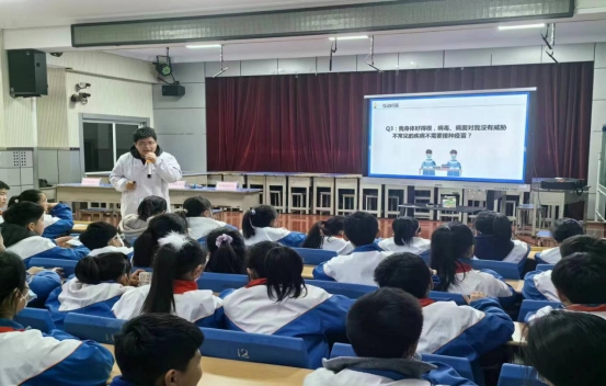 埇桥区疾病预防控制中心工作人员、安徽华康大药房执业药师受邀为师生们科普安全用药知识,针对青少年儿童的年龄特点及用药需求,详细讲解流感和肺炎支原体感染相关预防和治疗健康知识、疫苗接种注意事项、家庭药用误区等,通过PPT介绍、播放科普视频、互动问答等方式,提高师生们安全用药意识。活动现场气氛活跃,丰富的科普内容、新颖有趣的活动形式,吸引师生们热情参与,踊跃提问、积极讨论,进一步增强了宣传效果。