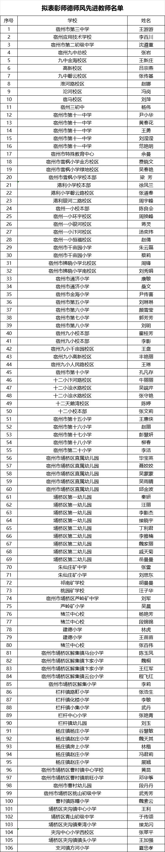 为促进“弘扬践行教育家精神”师德师风建设主题活动的深入开展,充分发挥先进典型事迹正面引导作用,进一步激发广大教师的职业荣誉感和教书育人的积极性、创造性,弘扬正能量,营造尊师重教浓厚氛围,经研究,拟对王游游等213名师德师风建设先进教师进行表彰,现予以公示。