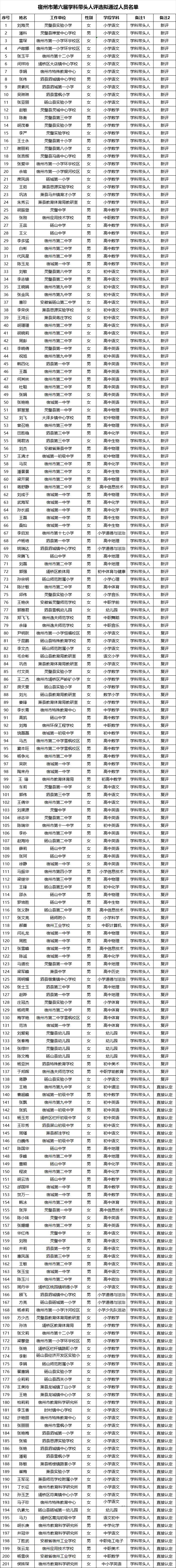 宿州市第六届学科带头人、骨干教师拟通过人员名单公示
