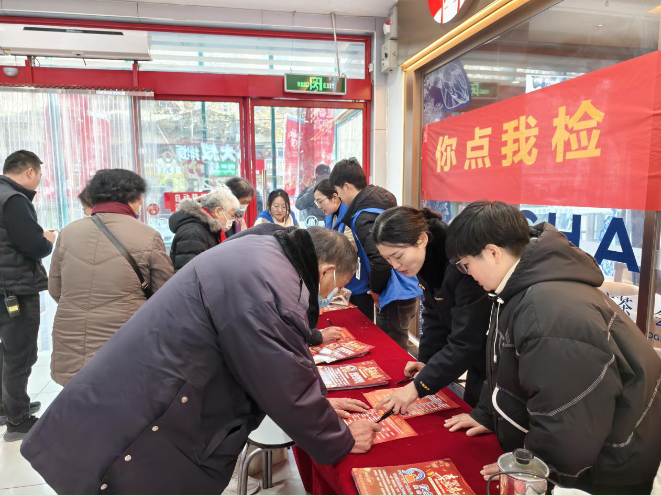 工作人员在大润发超市入口处设立了食品安全宣传台,现场不仅科普食品安全常识,还采用线上线下同步的方式,邀请群众填写食品安全“你点我检”抽检品种调查问卷,公开征集群众关注的食品品种、检验项目、抽样场所等建议,有助于市场监管部门更加精准地把握食品安全热点,更有针对性地开展抽检监测工作。
