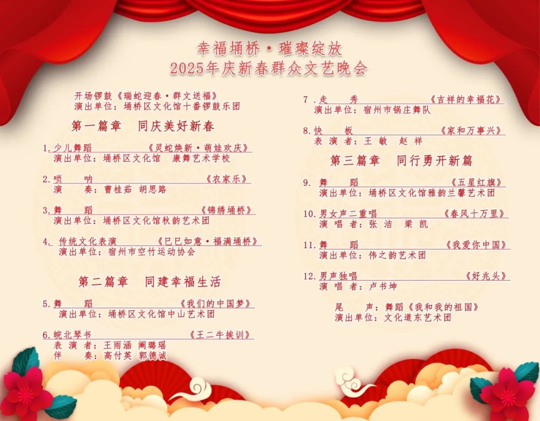 为深入学习贯彻党的二十大和二十届三中全会精神,以及习近平总书记考察安徽重要讲话精神,坚持以习近平文化思想为引领,开创文化繁荣发展新局面,回顾埇桥一年来的成绩,展现埇桥人民“埋头苦干、勇毅前行”的精神面貌,表达埇桥人民建设和谐幸福家园的豪情,着力营造欢乐祥和、喜庆热烈、文明向上的浓厚节日氛围。由埇桥区文化馆主办,埇桥区南关街道办事处、南关街道广场社区、宿州苏宁广场协办的“我们的节日·元宵——幸福埇桥·璀璨绽放2025年庆新春群众文艺晚会”即将精彩开演!