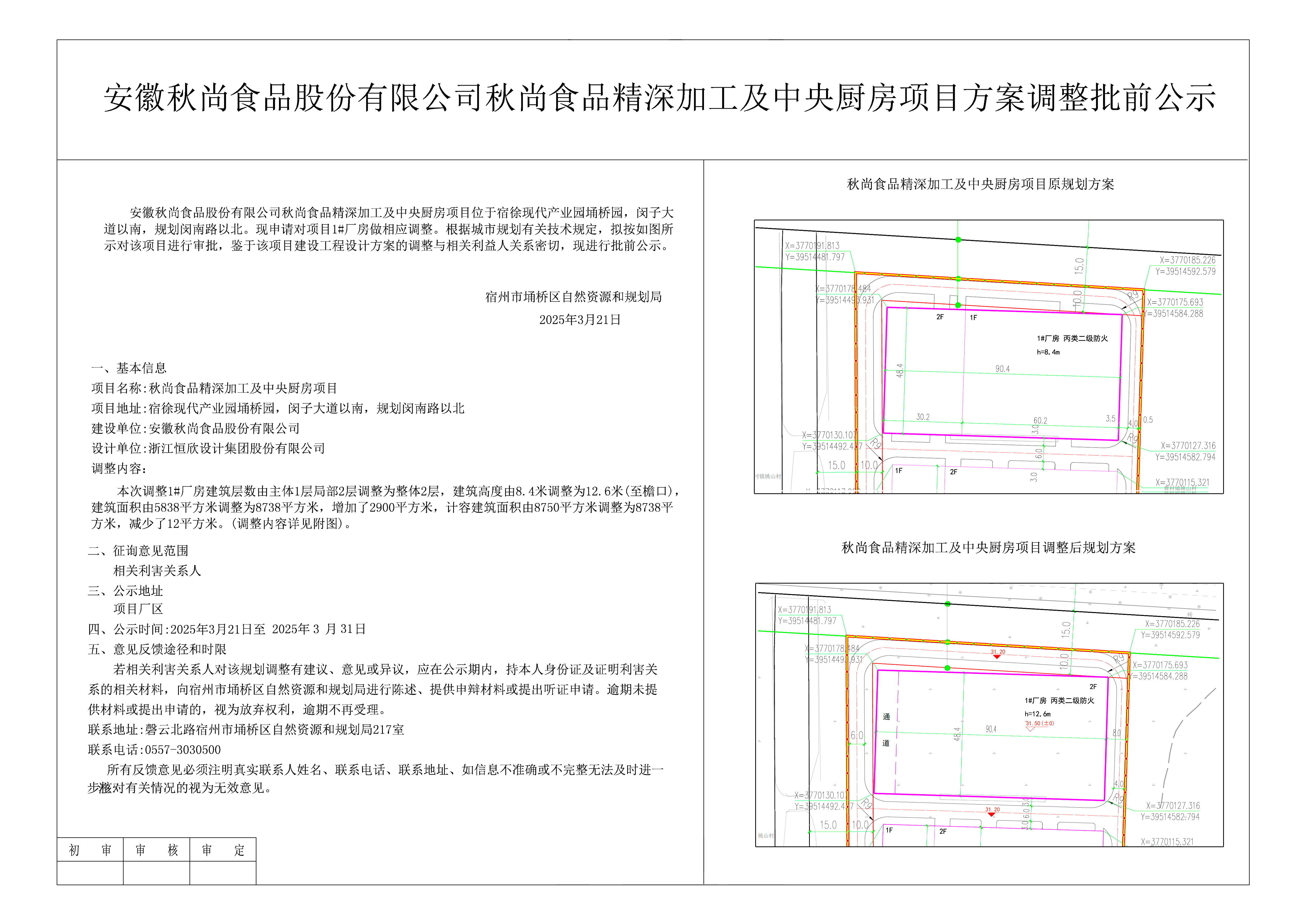 安徽秋尚食品股份有限公司秋尚食品精深加工及中央厨房项目规划方案调整批前公示