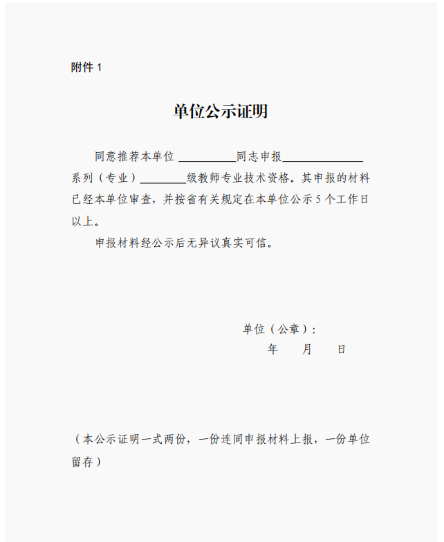 (二)表格:《中小学教师专业技术资格评审表》,申报教师可从申报系统导出,A3纸双面打印,一式2份,逐级审核盖章上报;