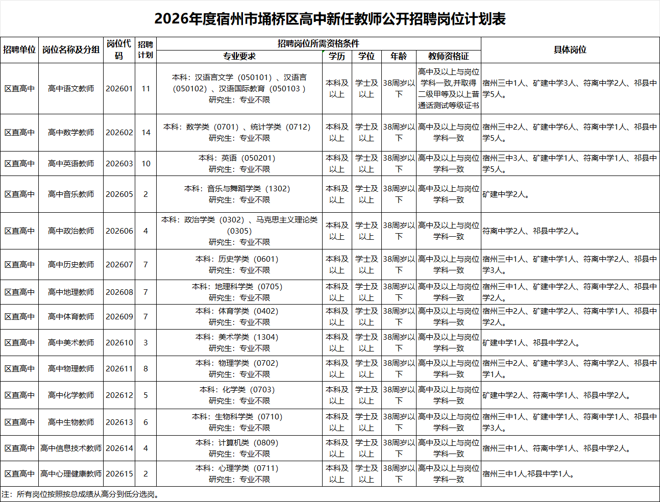 附件:2026年度宿州市埇桥区公开招聘高中新任教师岗位计划表