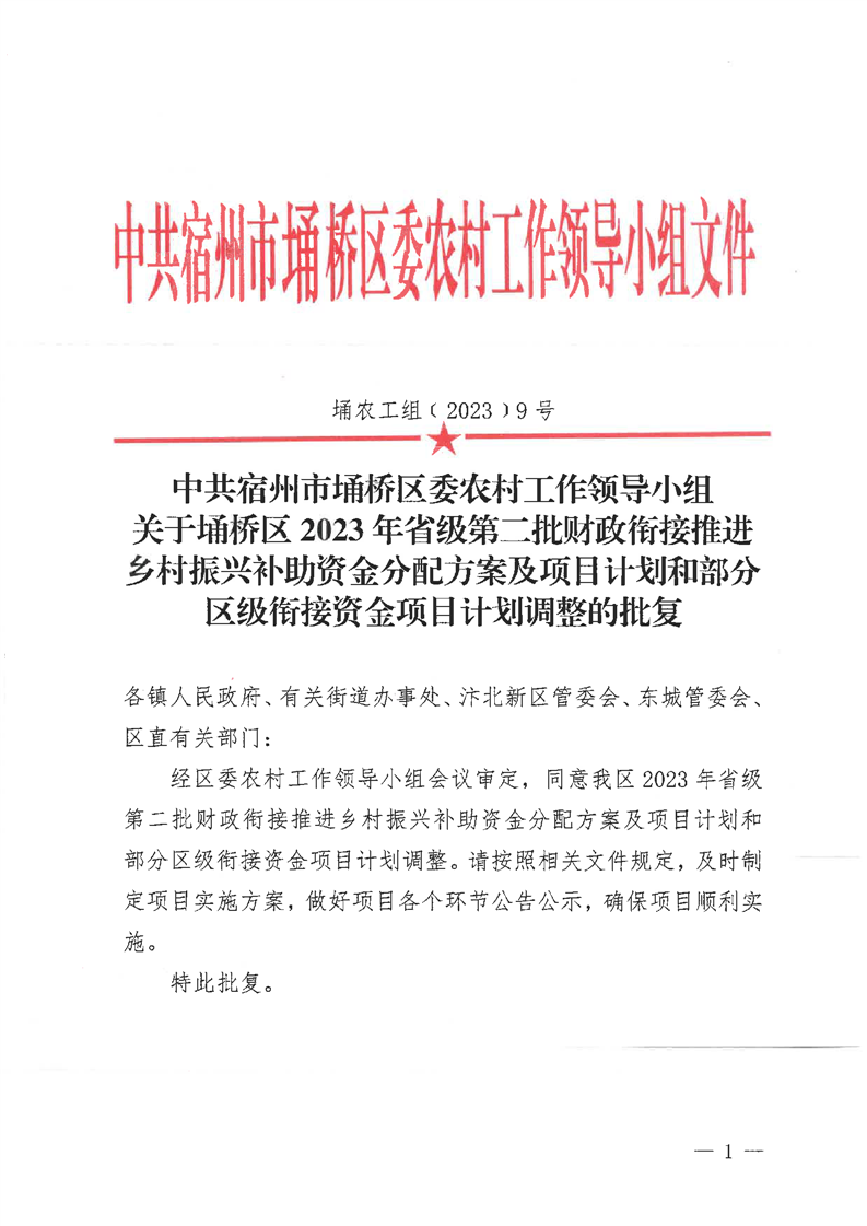 关于埇桥区2023年省级第二批财政衔接推进乡村振兴补助资金分配方案及项目计划和部分区级衔接资金项目计划调整的批复