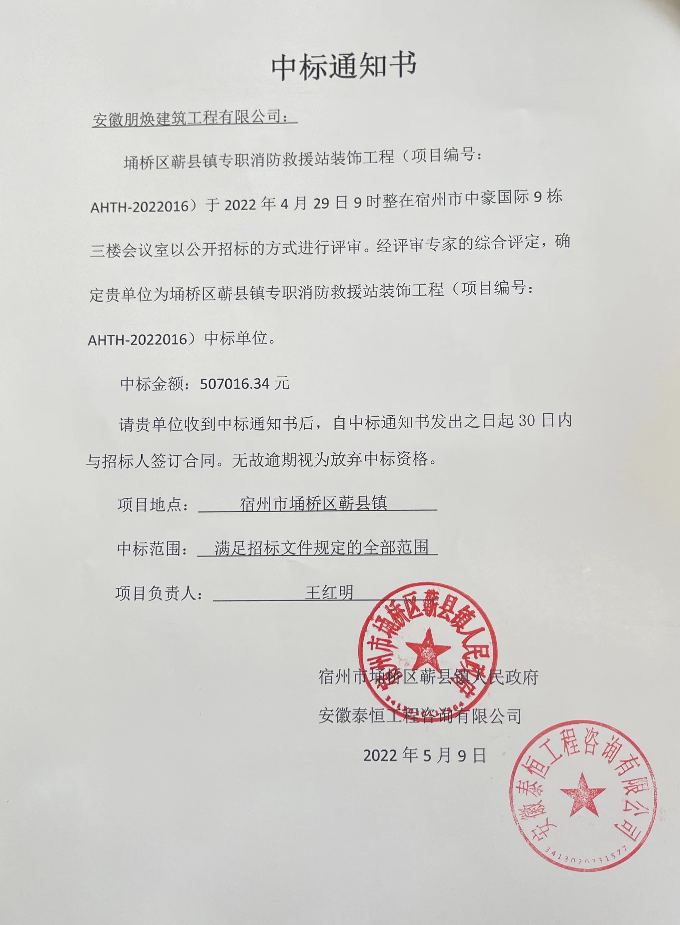 【项目中标通知书】埇桥区蕲县镇专职消防救援站装饰工程中标通知书