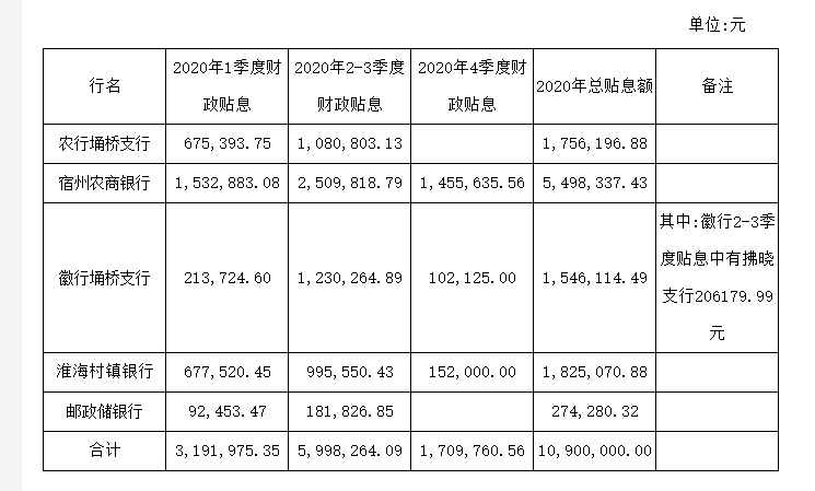 埇桥区2020年扶贫小额信贷贴息情况