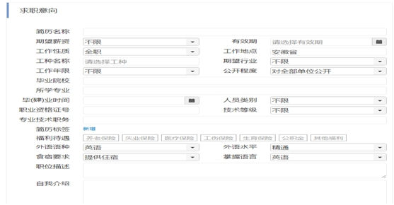 进入个人求职中心,点击我的简历,可新建简历,完善简历各项信息;