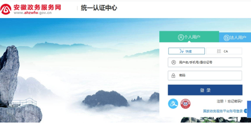 进入安徽政府服务网登录中心,选择个人用户登录/注册,已有账号的直接登录,没有注册过的个人用户注册安徽政务服务网新用户登陆后跳转。