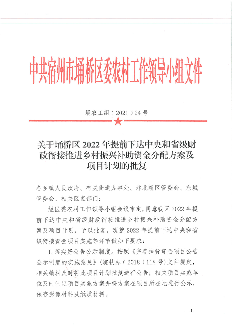 埇桥区2022年提前下达中央和省级财政衔接推进乡村振兴补助资金分配方案及项目计划批复