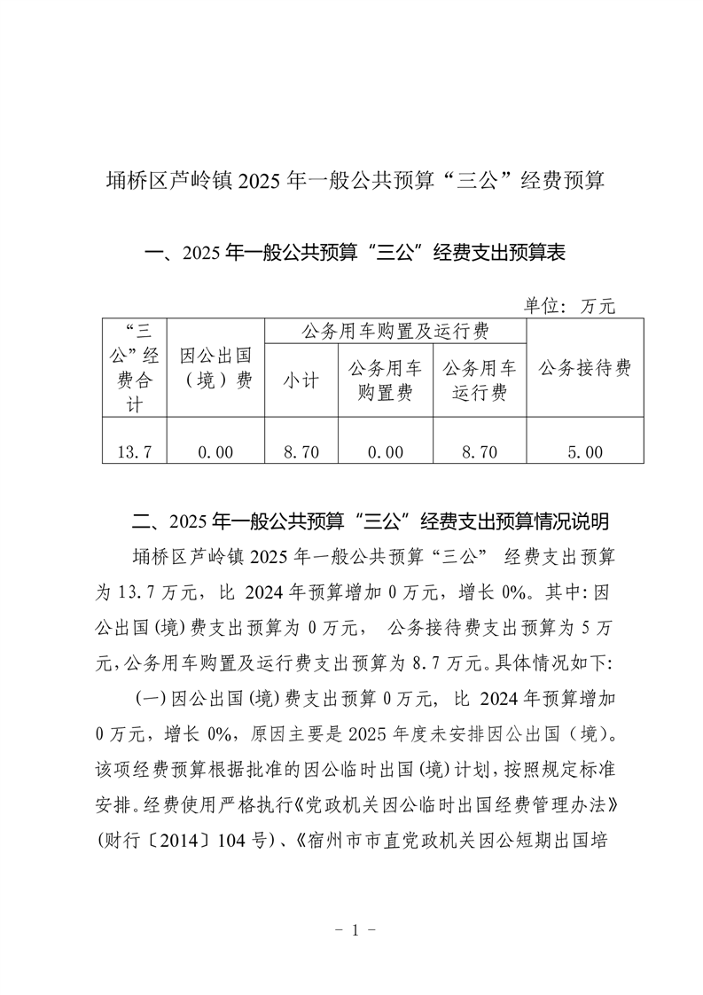 埇桥区芦岭镇2025年一般公共预算“三公”经费预算