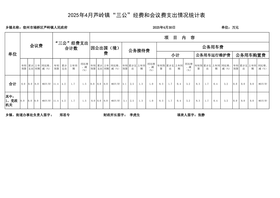芦岭镇2025年4月“三公”经费和会议经费支出情况统计表