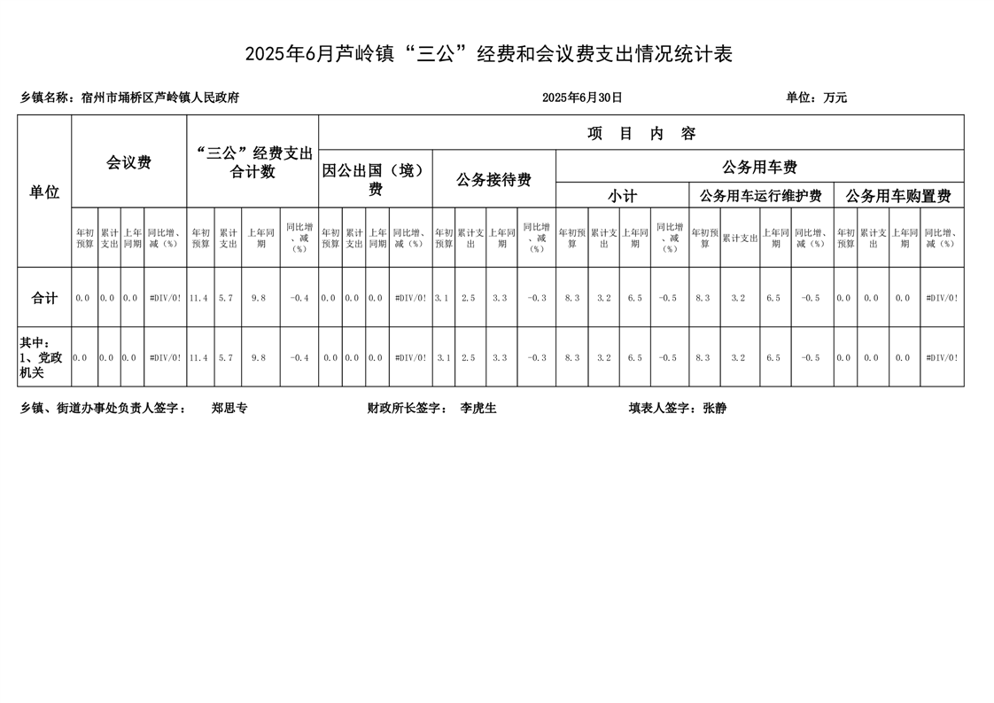 芦岭镇2025年6月“三公”经费和会议经费支出情况统计表