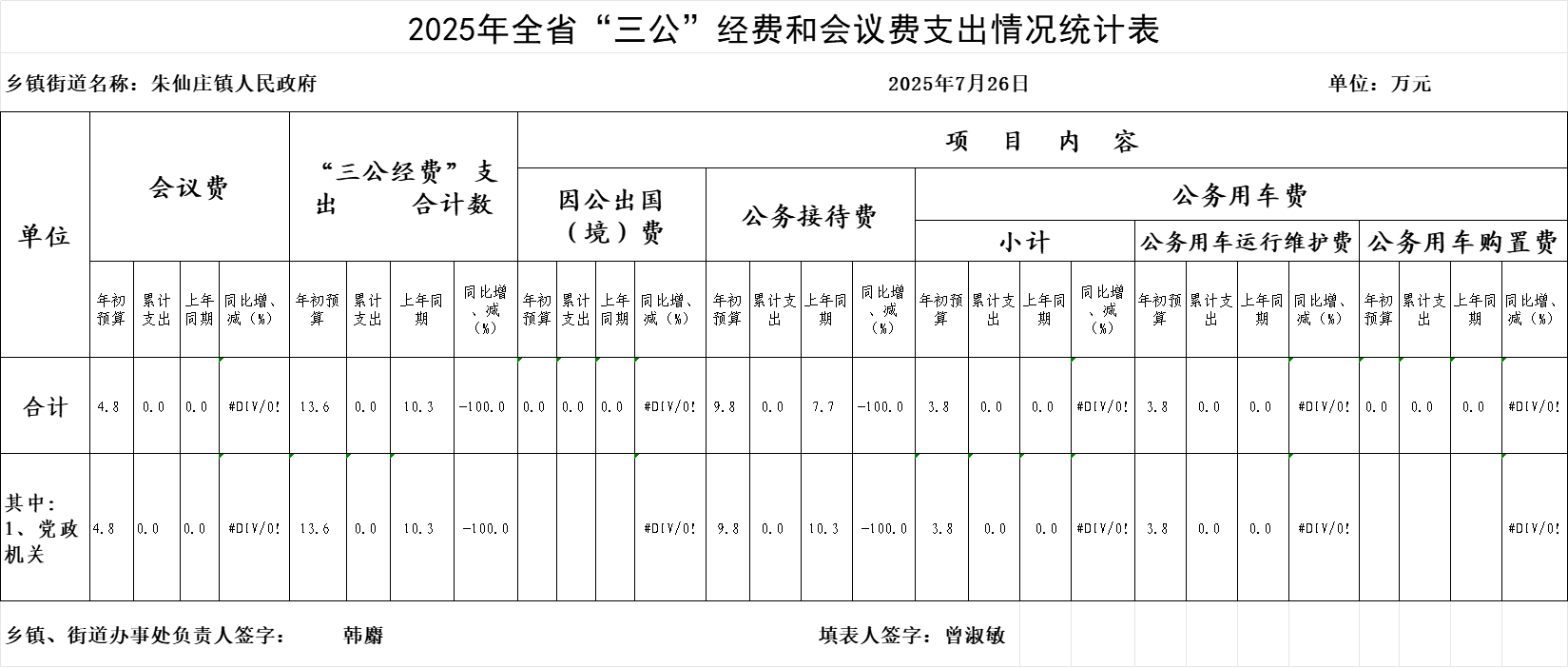 朱仙庄镇2025年7月份“三公”经费和会议费支出情况统计表