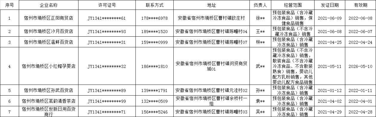 曹村镇2021年第二季度食品经营许可基本信息