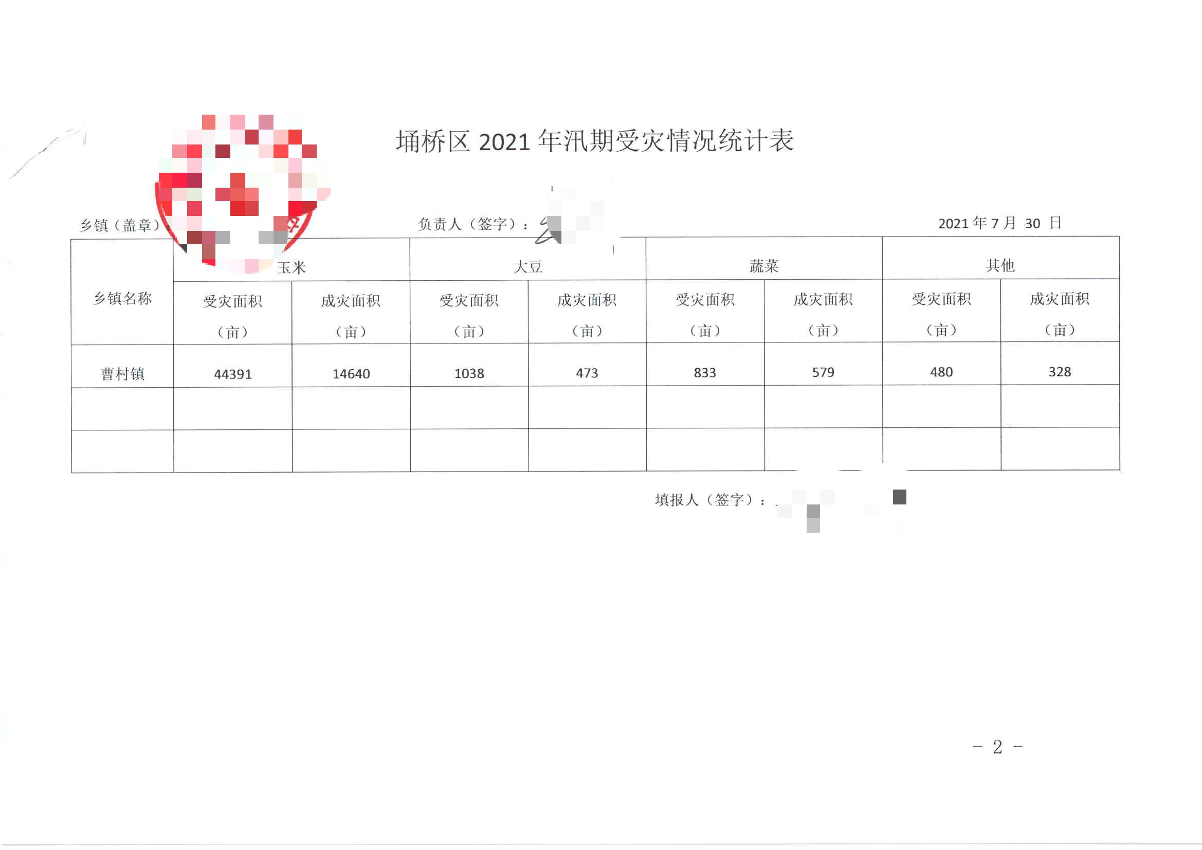 灾情核定:曹村镇2021年第三季度受灾信息统计