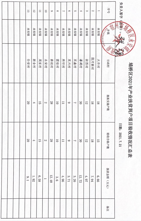 埇桥区永安镇2021年双兴村产业扶贫到户项目验收情况汇总表