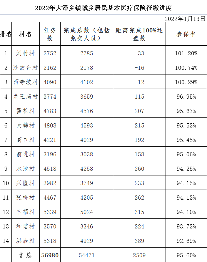 2022年大泽乡镇城乡居民基本医疗保险征缴进度(截止到2022年1月13日)