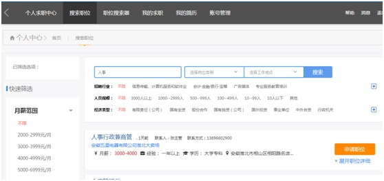 点击个人求职中心搜索职位,可按岗位类别、工作地点设置检索条件进行搜索,便于精确查找职位,可查看单位联系方式、进行投递简历等操作;