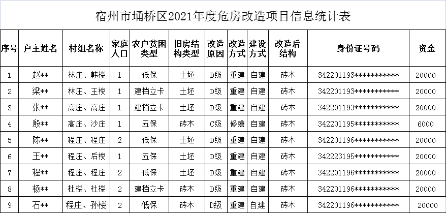 宿州市埇桥区杨庄乡2021年度危房改造户主信息