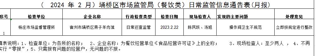 【监管执法抽查结果、查处情况】(2024年2月)埇桥区市场监管局(餐饮类)日常监管信息通告表