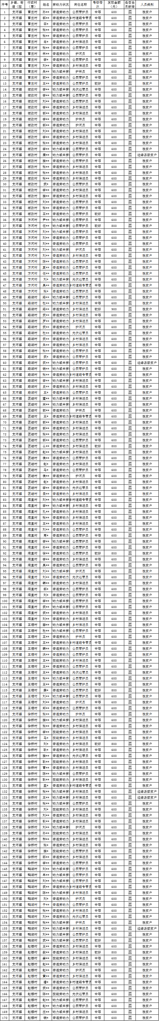 【公益性岗位】2025年8月支河镇乡村公益岗位贫困劳动者花名册
