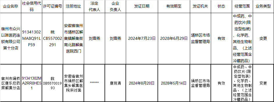 埇桥区解集镇市场监督管理所2024年第三季度药品零售许可企业备案信息公示