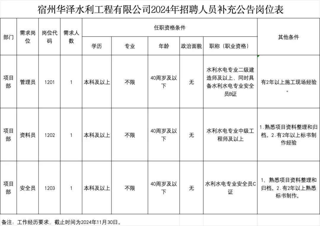 附件1. 宿州华泽水利工程有限公司2024年招聘人员补充公告岗位表