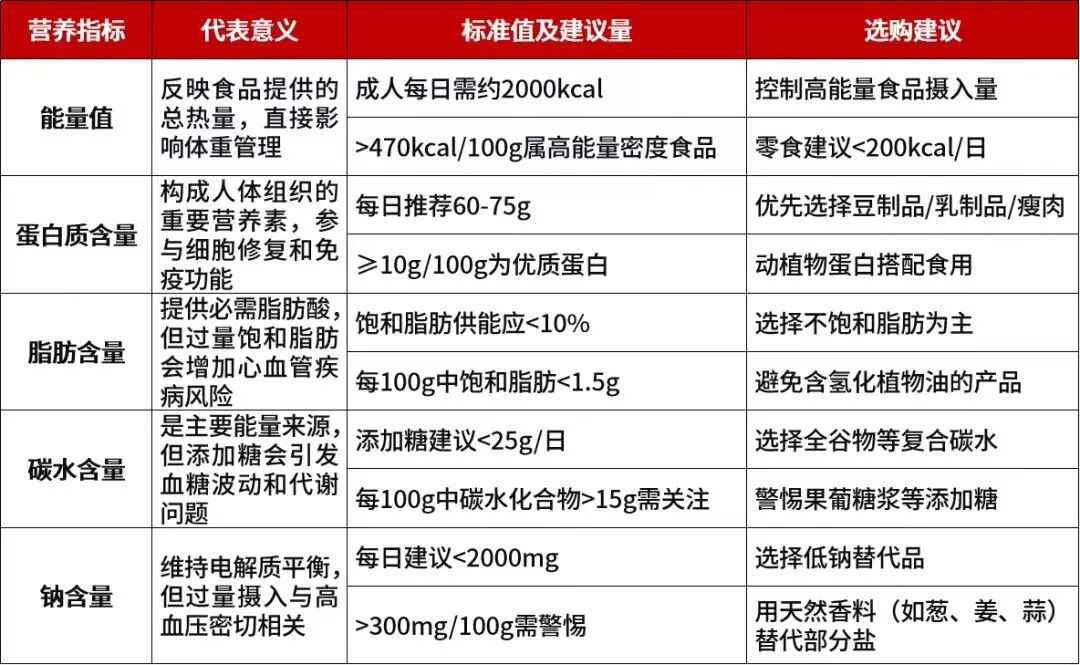 ✅ 这张表直观反映了食品的核心营养构成。重点关注五项基础指标:能量、蛋白质、脂肪、碳水化合物、钠。