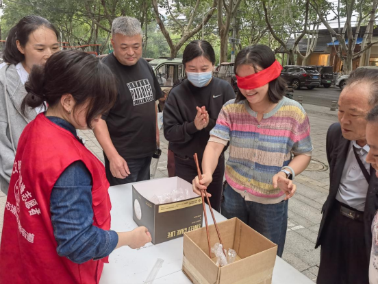 活动现场,居民们满怀期待,跃跃欲试。在志愿者的引导下,大家依次排队,每人有5次套圈机会。大家各显神通,套圈方法花样百出。在欢呼声中,有的居民一次即中,有的在第二圈成功,更有高手圈圈中奖。为确保每位参与者都有所收获,在蒙眼夹月饼游戏中,参与者均可获得月饼奖励,现场洋溢着浓厚的节日氛围。
