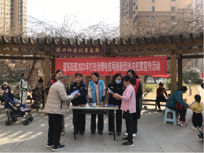 3月19日,道东街道多部门联合开展2023年打击治理电信网络新型违法犯罪宣传活动。活动现场以发放反诈宣传单的同时,为大家介绍目前各种电信网络新型诈骗形式。工作人员以案例的形式用通俗易懂的语言为大家讲解反诈知识,提醒大家不相信陌生来电、不点击未知链接、不透露个人信息。