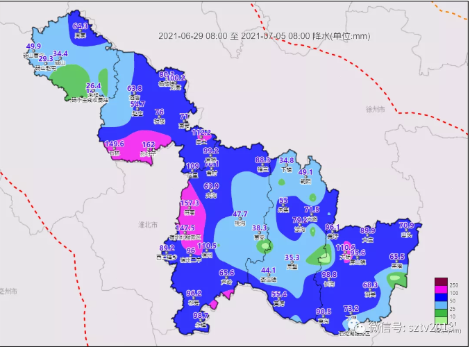 6月29日08时至7月5日08时,受强对流和冷暖空气影响,我市104个站点降水量超过25毫米,砀山北部、萧县中东部、埇桥大部、灵璧中东部和南部、泗县大部76个站点超过50毫米,萧县、埇桥和泗县部分地区18个站点超过100毫米,最大萧县孙圩子(162.0毫米)
