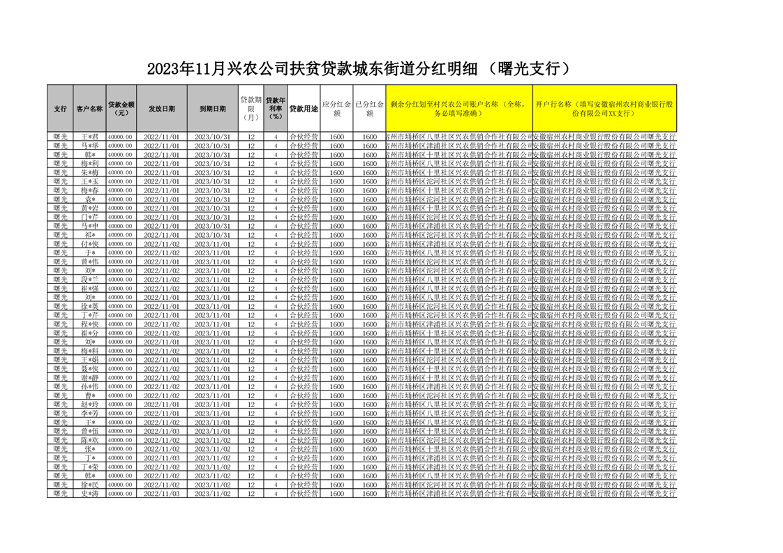城东街道2023年11月扶贫贷款分红明细(曙光支行)