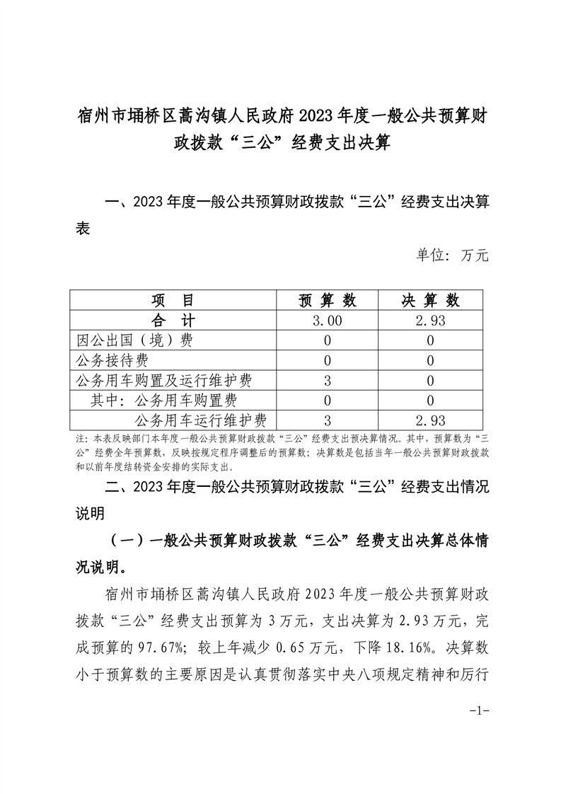 宿州市埇桥区蒿沟镇人民政府2023年度一般公共预算财政拨款“三公”经费支出决算