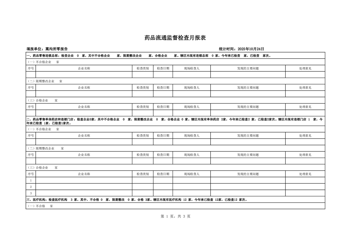 蒿沟所2025年10月药品月报表