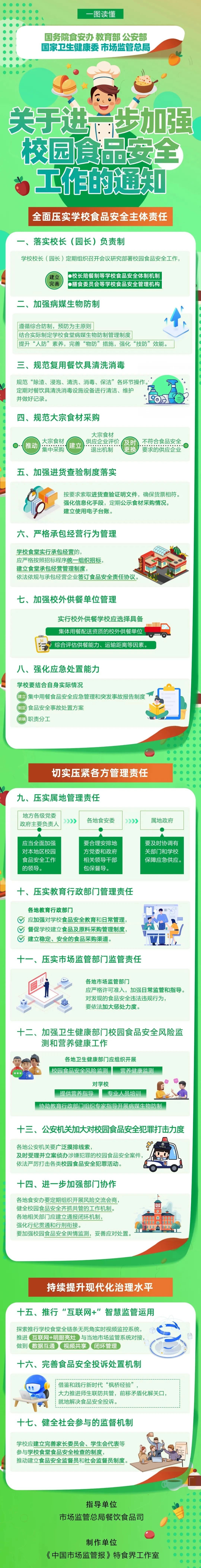 近日,国务院食安办联合教育部、公安部、国家卫生健康委、市场监管总局印发《关于进一步加强校园食品安全工作的通知》(以下简称《通知》),聚焦校园食品安全主体责任、管理责任和现代化治理水平,部署各地进一步健全校园食品安全全链条防控风险的制度机制,强化校园食品安全保障。
