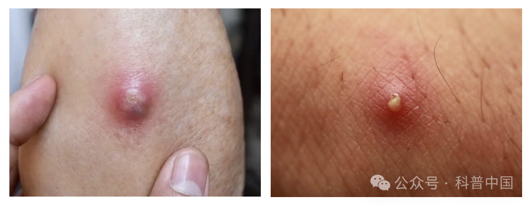 疖的皮疹初起为与毛囊口一致的红色实性小丘疹,逐渐增大成红色硬性结节,有疼痛及压痛,通常 2~3 天后,结节会化脓坏死而形成脓肿,有时还可以伴有发热、头痛不适等全身症状。
