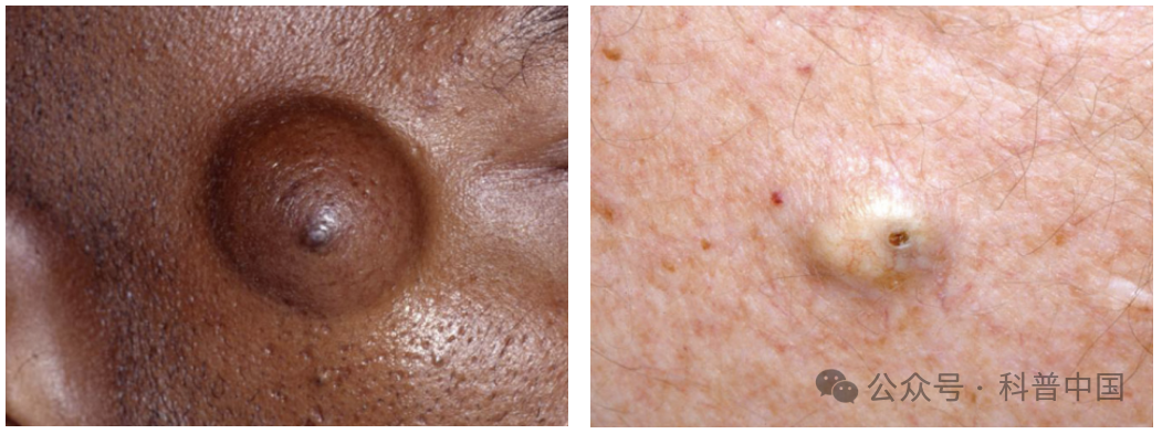 ● 肤色到蓝灰色的硬丘疹或结节 ;