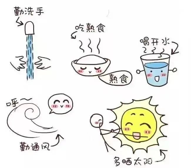 (2)养成良好的卫生习惯,饭前便后勤洗手,不喝生水,不吃生冷食物。在流行季节要避免与有发热、出疹的儿童接触,减少去人群拥挤场所。