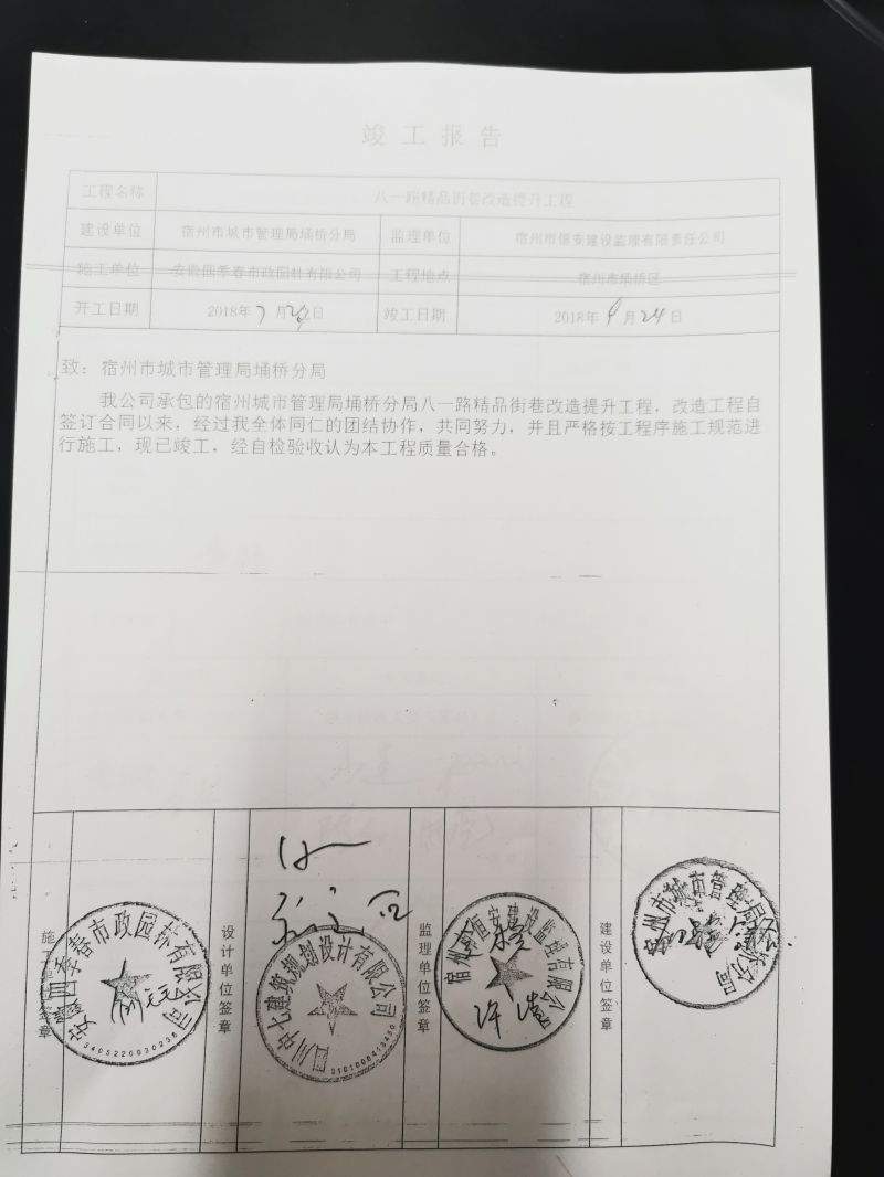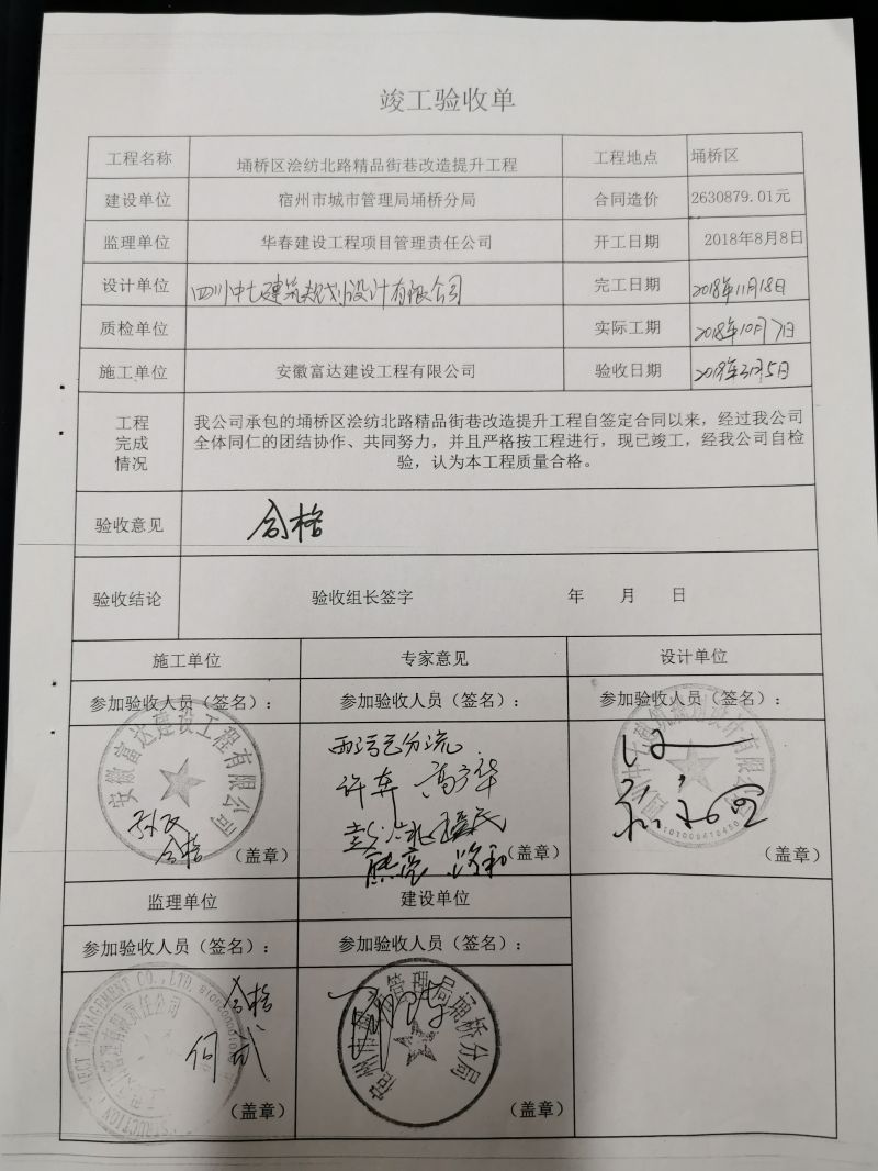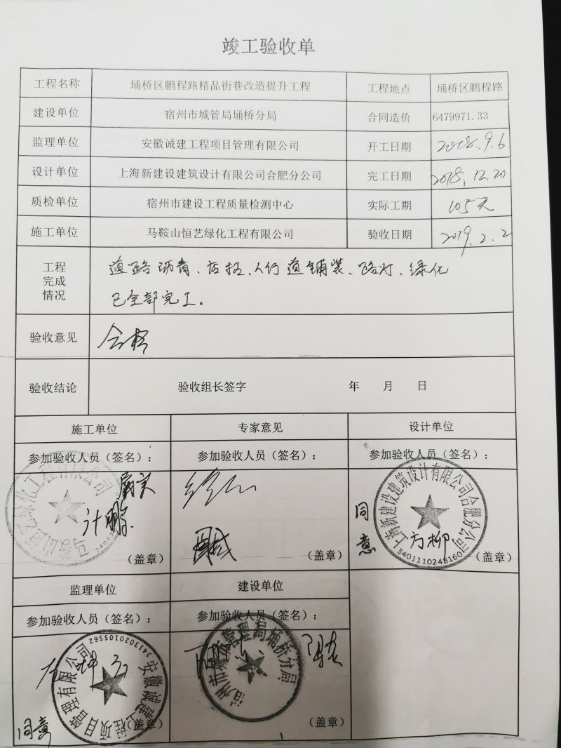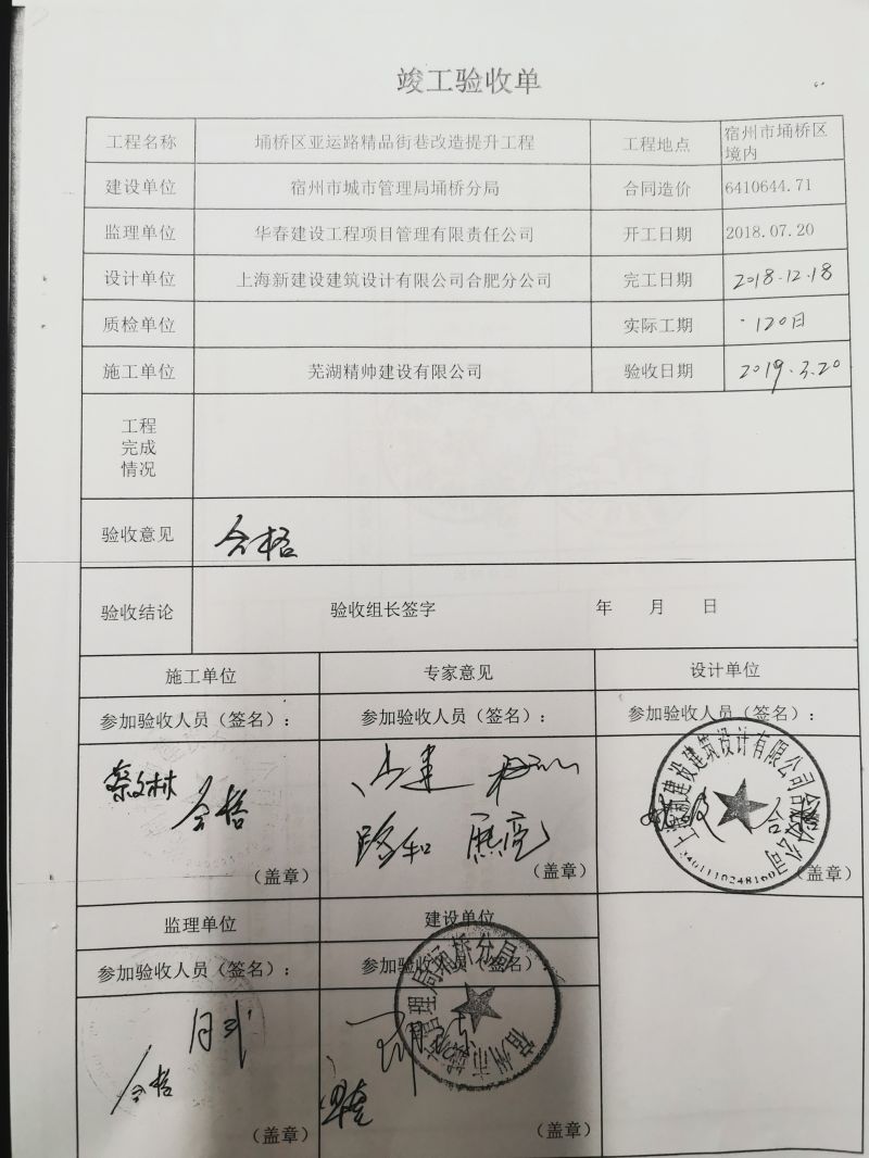 2018年城区精品街巷改造提升工程验收单